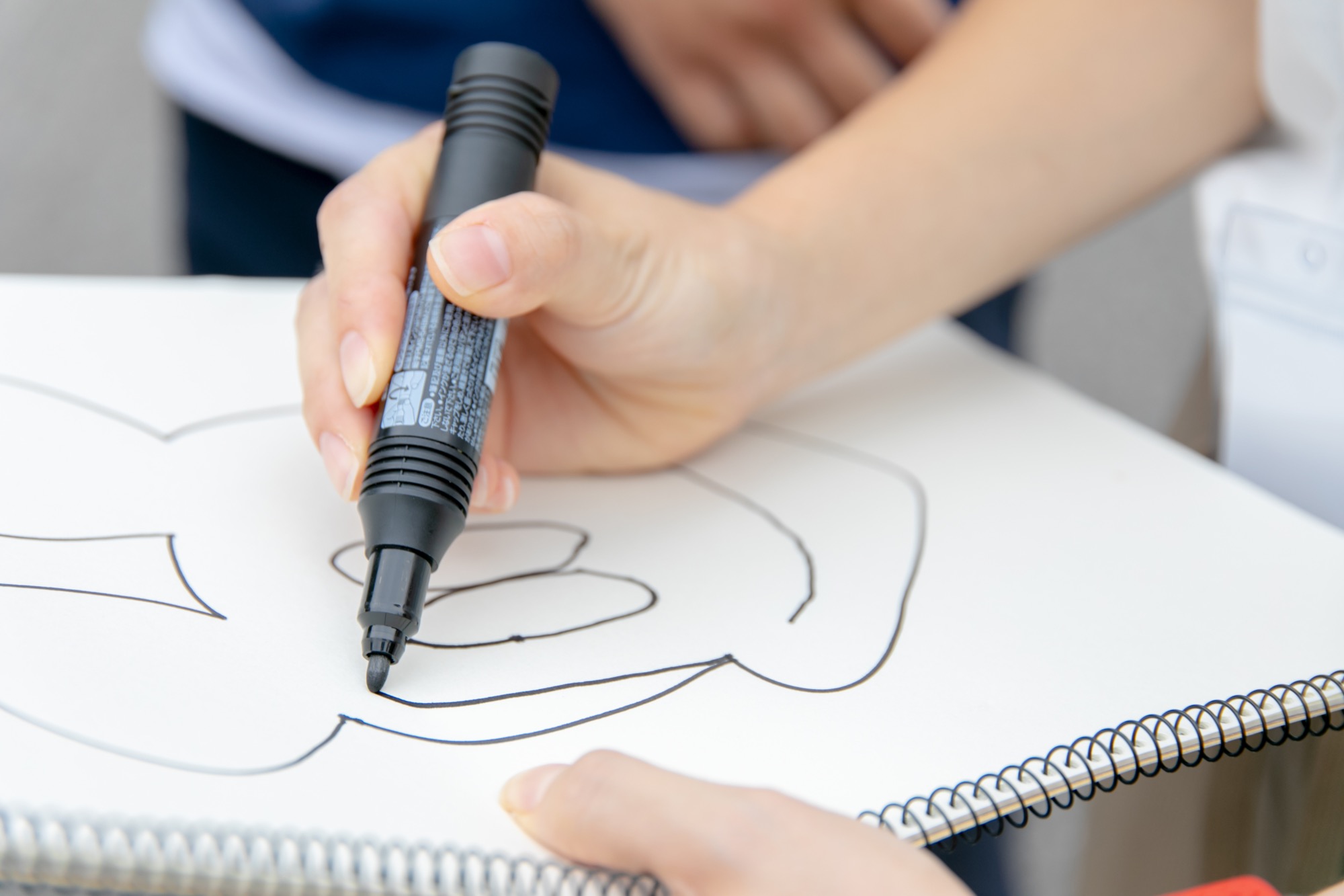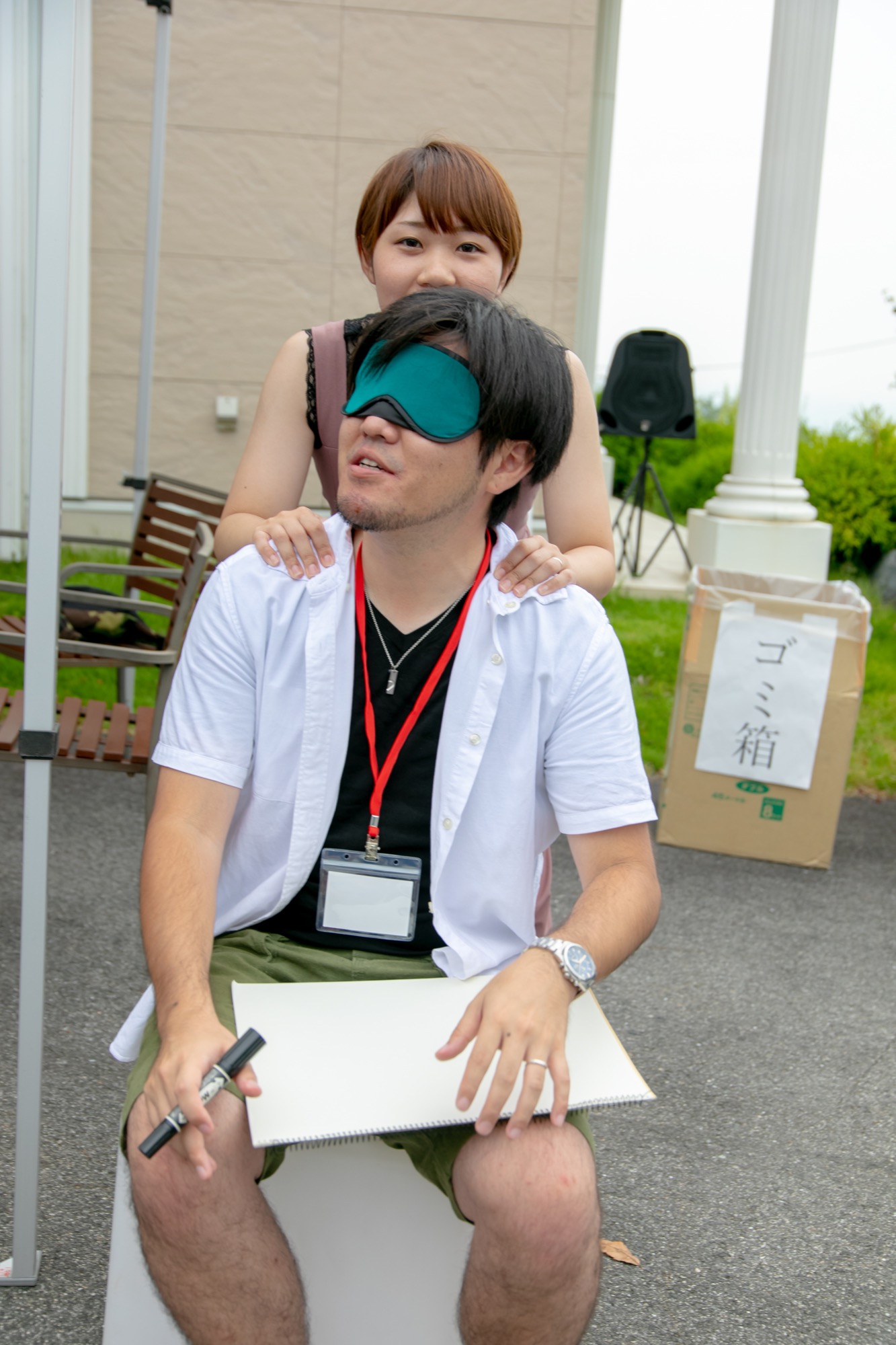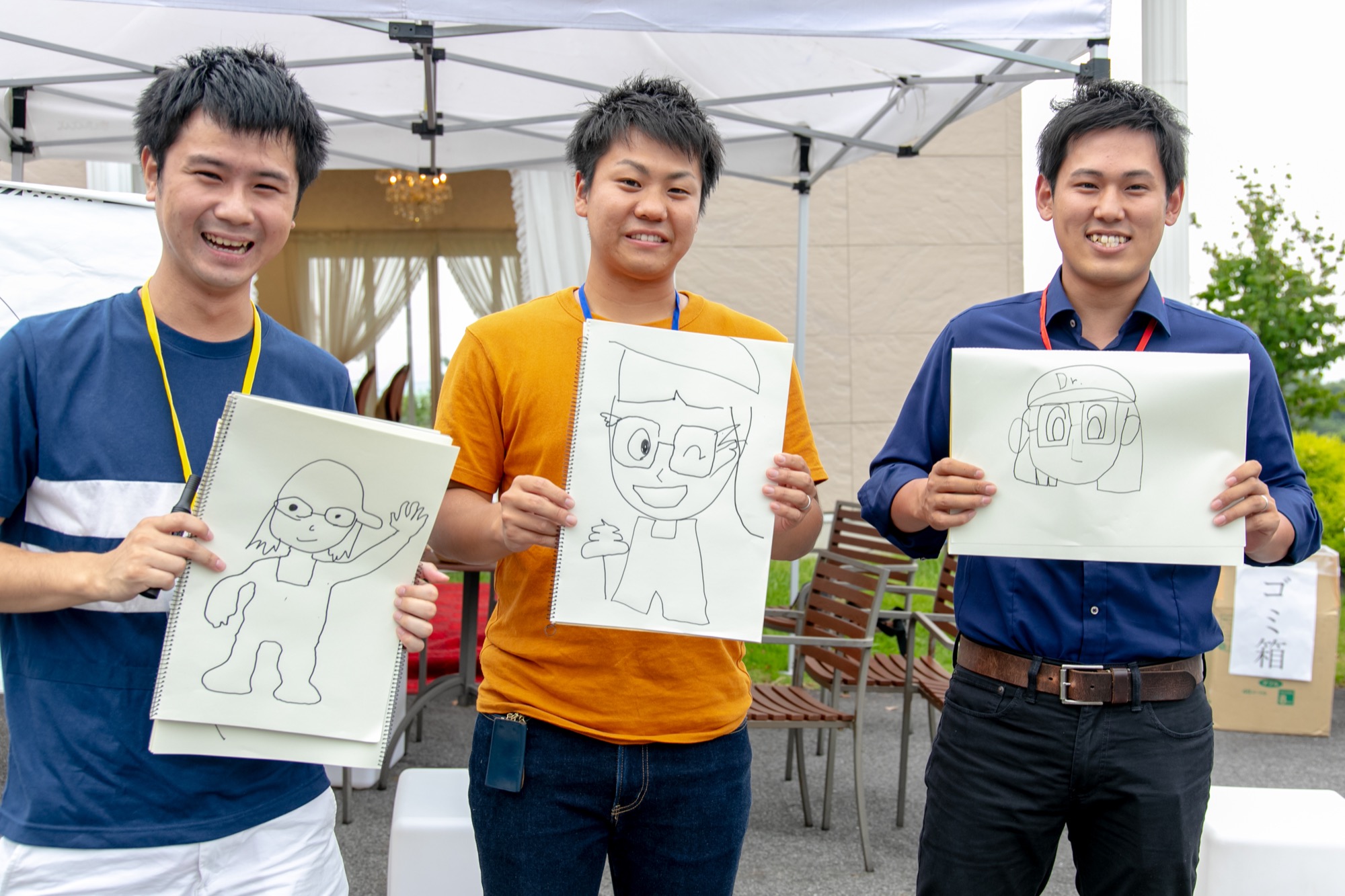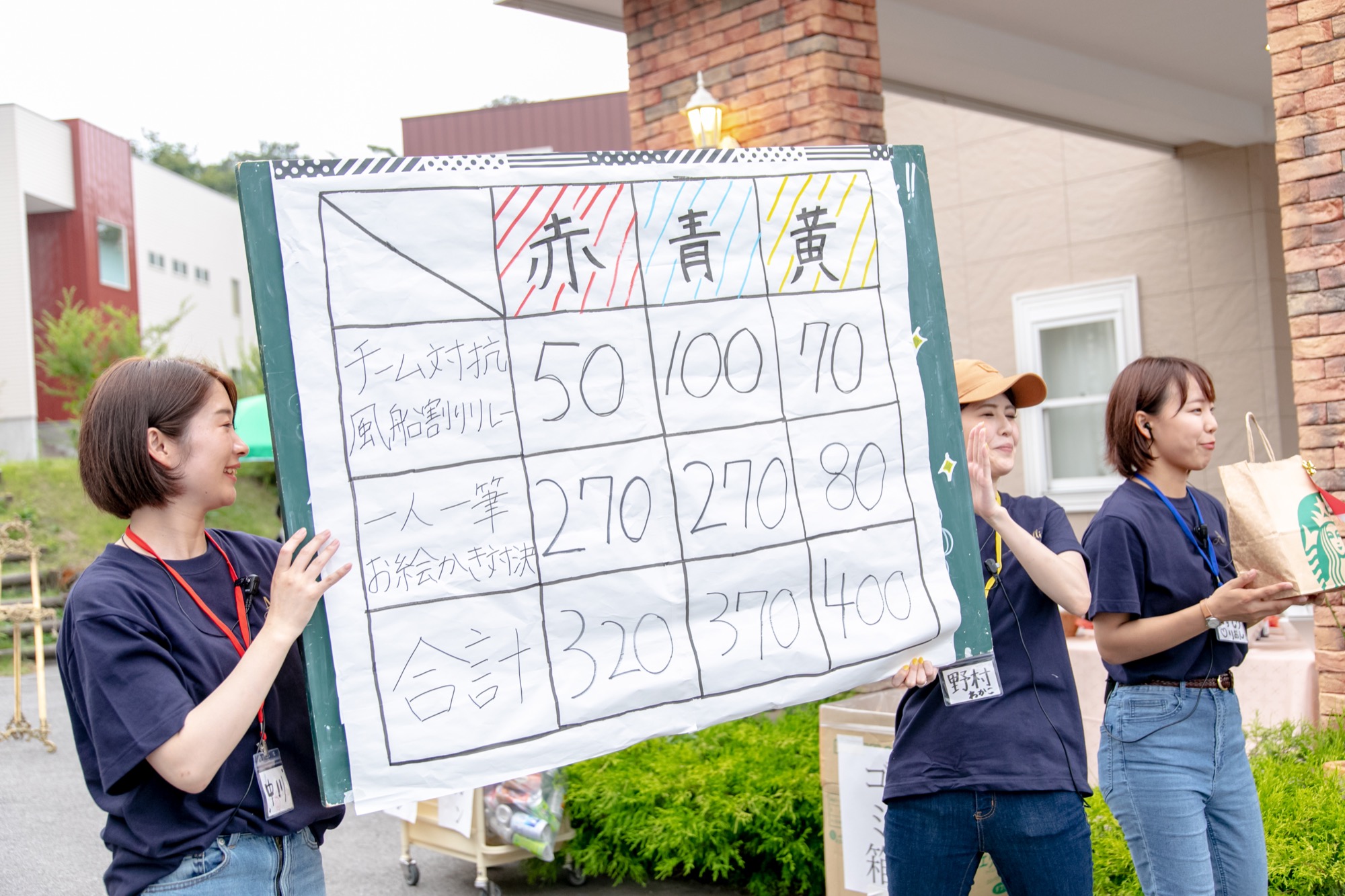 3チームに分かれて景品をかけて風船割りをしたり、一人一筆描きをしたり・・・