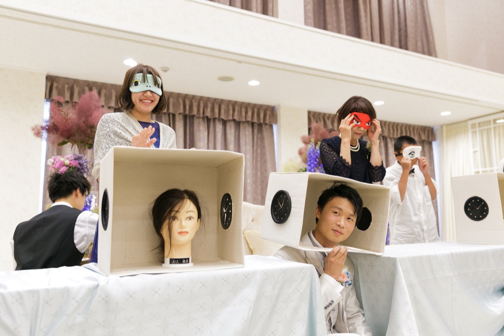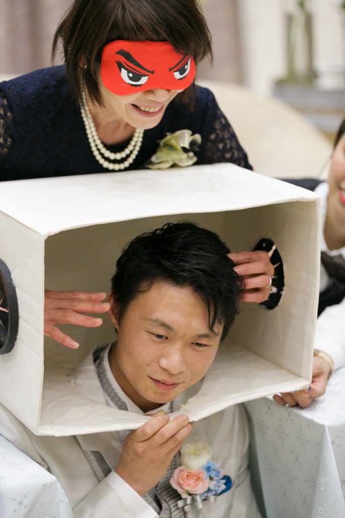 自分のお面をかぶった新郎がパーティー前にドリンクをサーブしていたり、(ゲストに気づかれるかドキドキ・・・)
