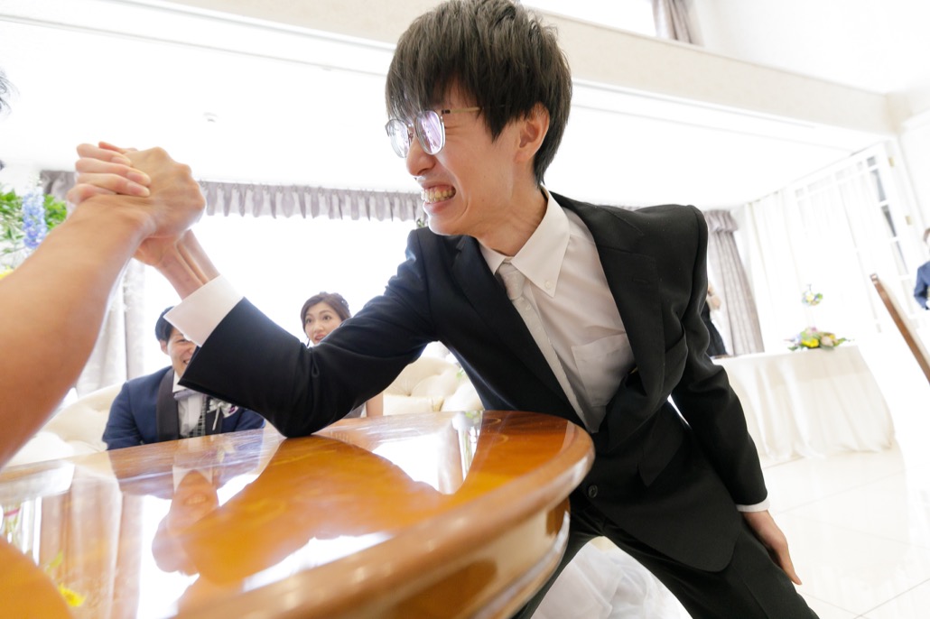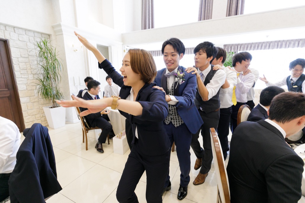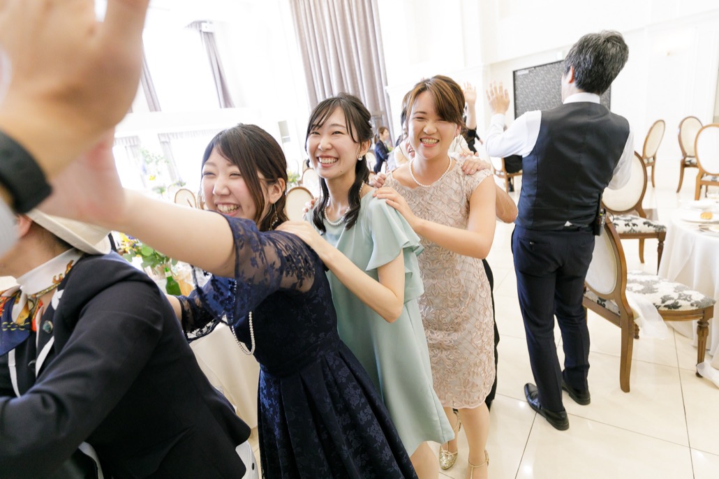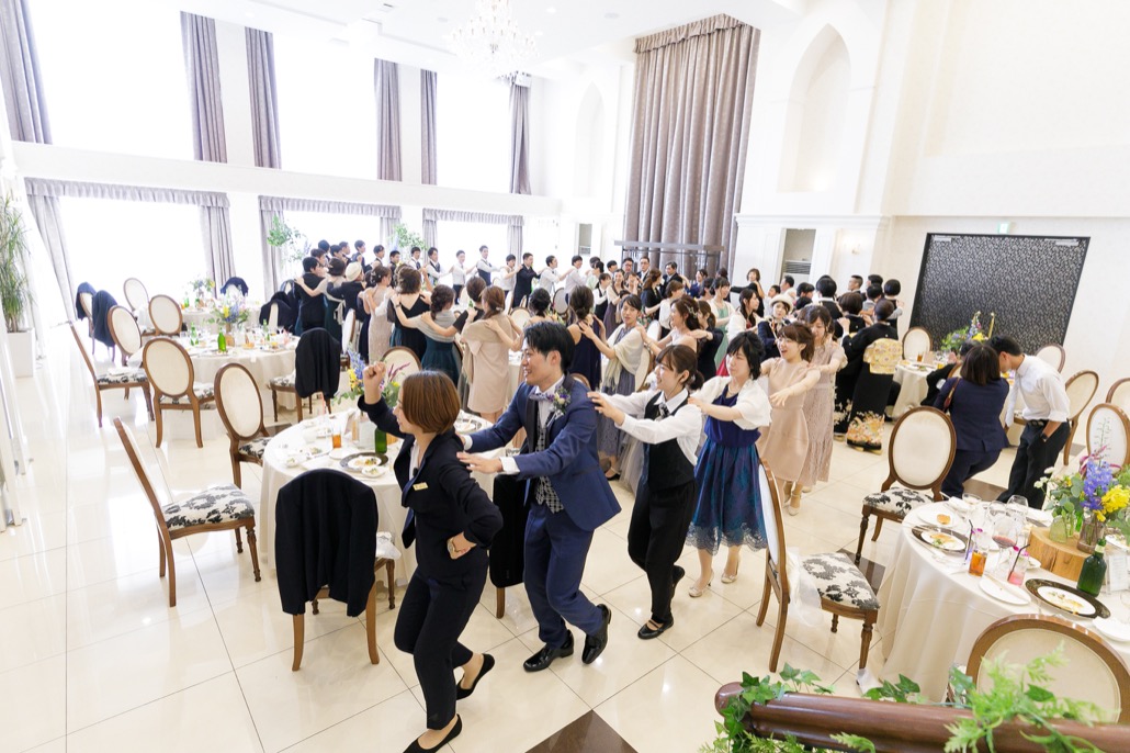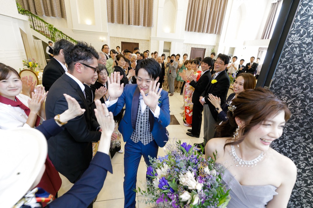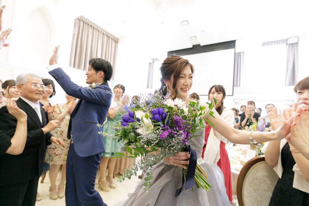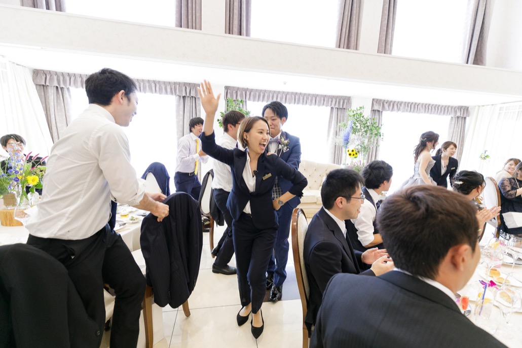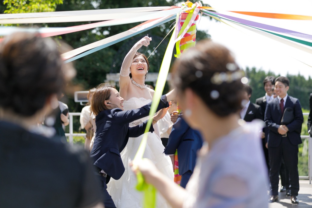 ハイタッチ以外にも挙式前に握力テストをおこないゲームに参加するメンバーを選出したり、パーティー中はリボンが最後まで残った方にブーケの当たるメリーゴーランドプルズを行ったり、おめでとうの言葉以外にもゲストの動きが加わる結婚式だったのでいつも以上にみんなの笑顔が輝く時間になりました。