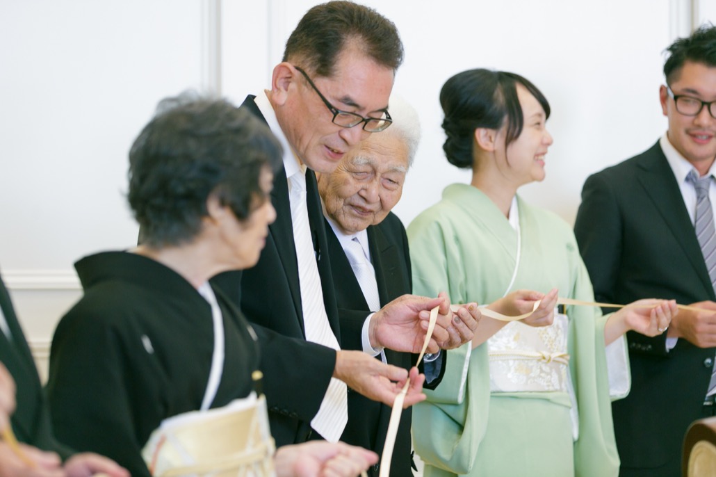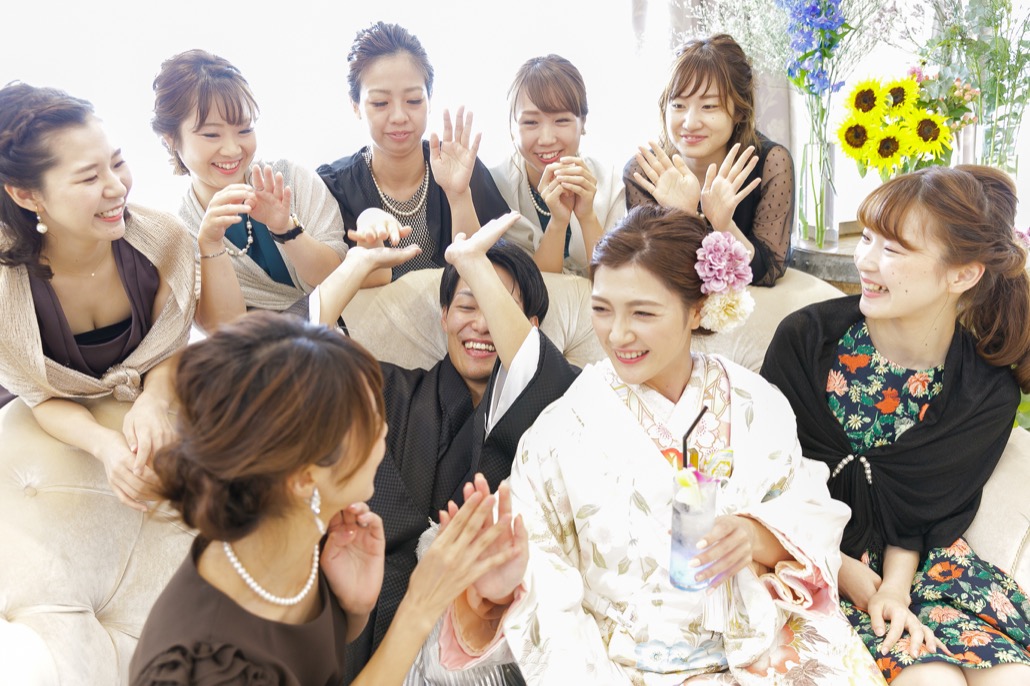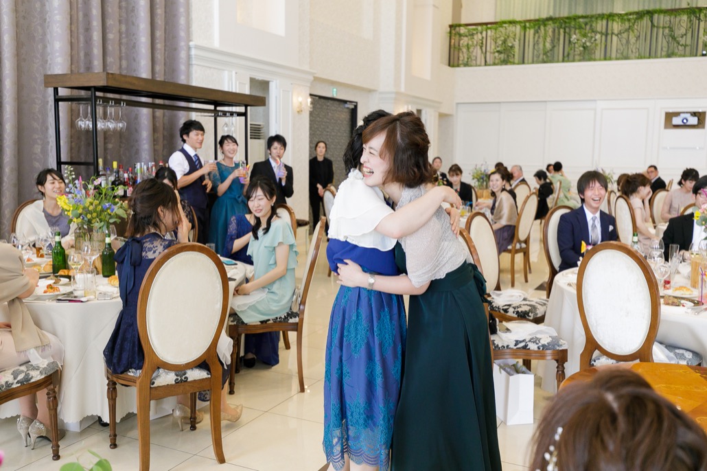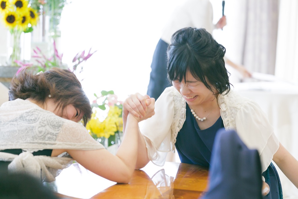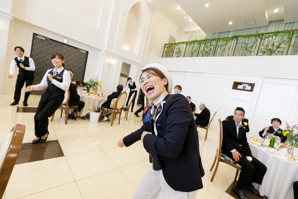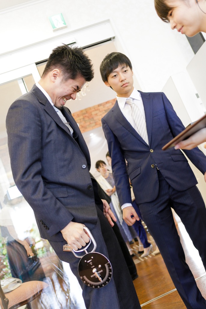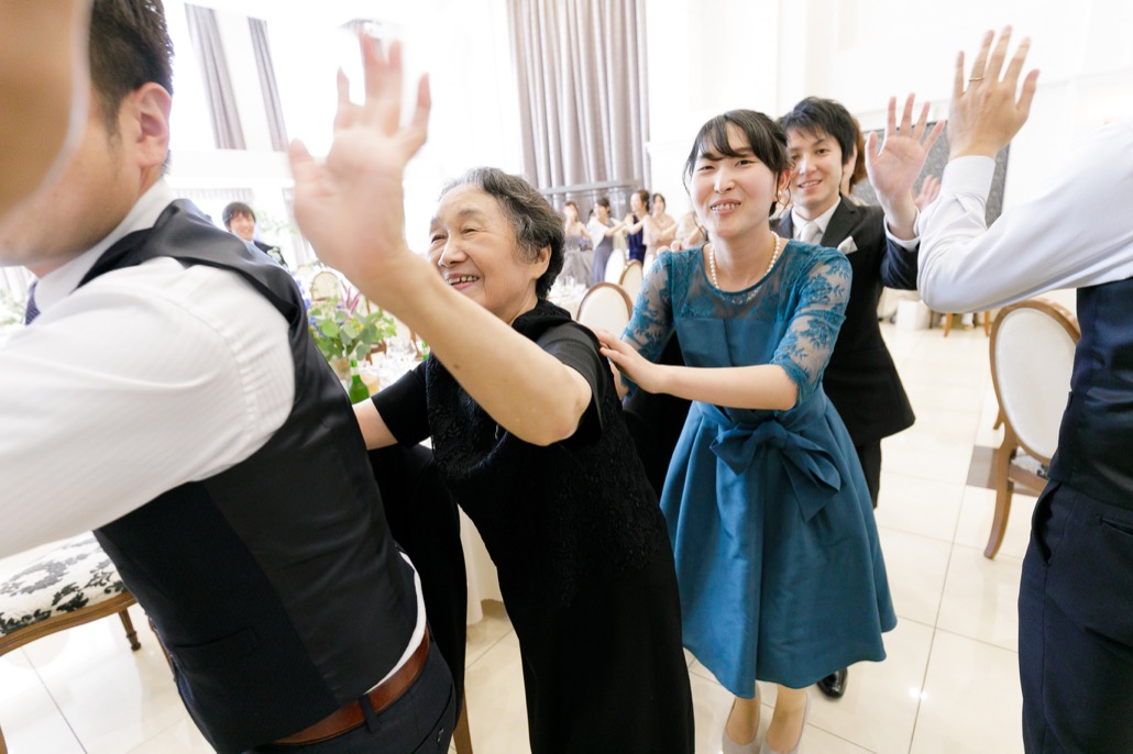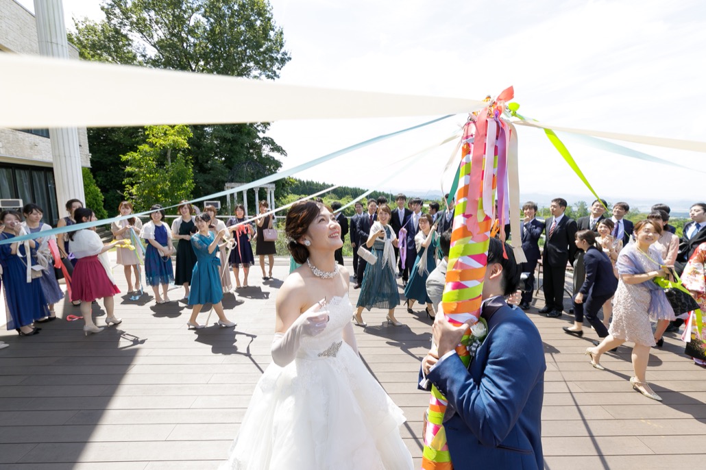 ハイタッチ以外にも挙式前に握力テストをおこないゲームに参加するメンバーを選出したり、パーティー中はリボンが最後まで残った方にブーケの当たるメリーゴーランドプルズを行ったり、おめでとうの言葉以外にもゲストの動きが加わる結婚式だったのでいつも以上にみんなの笑顔が輝く時間になりました。