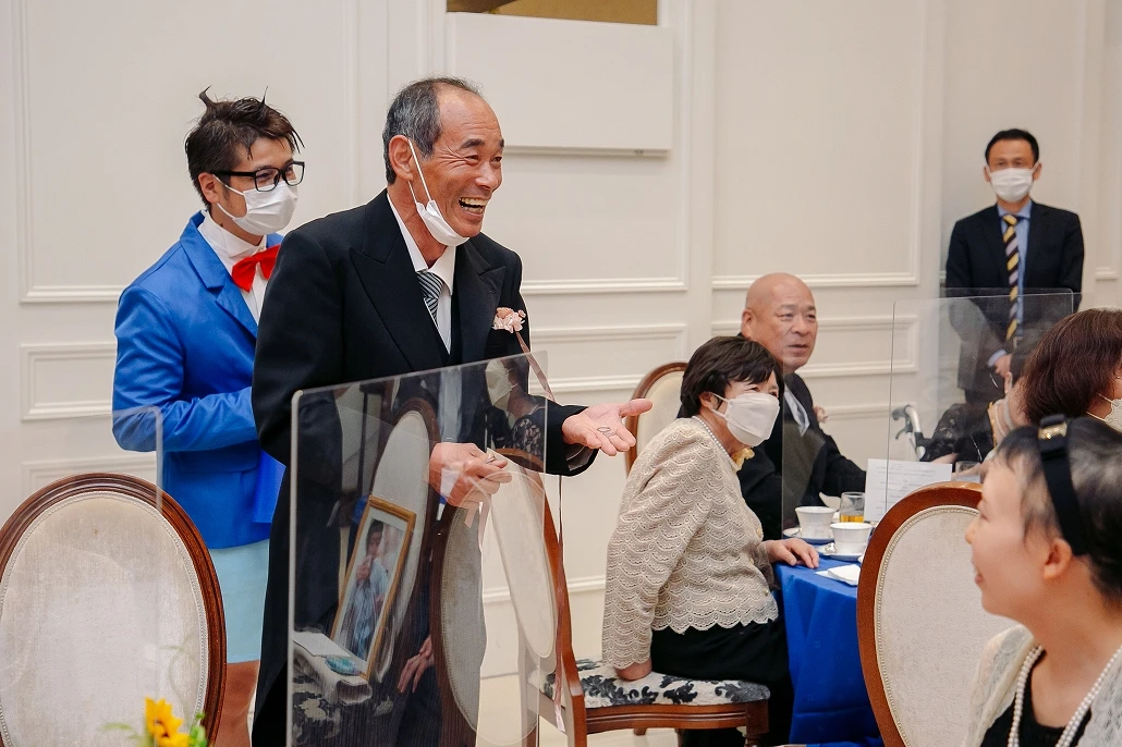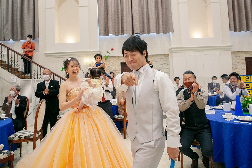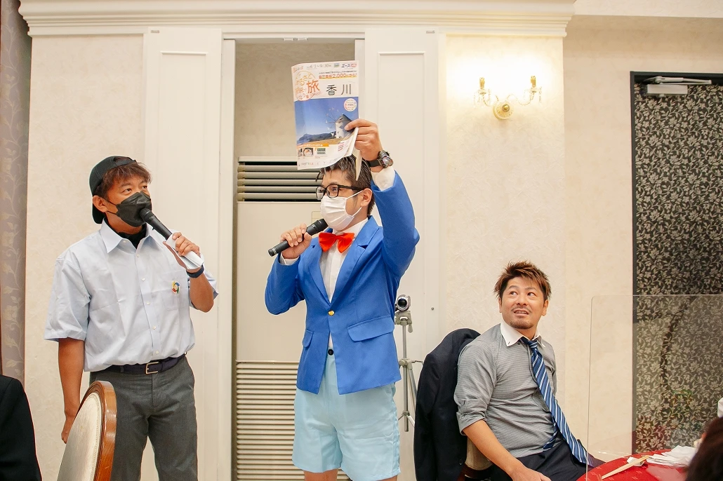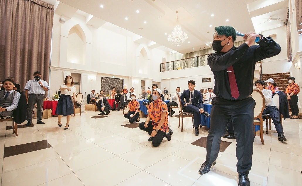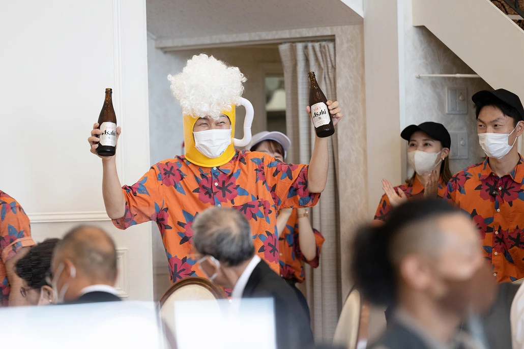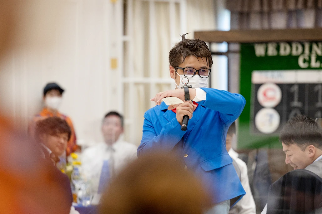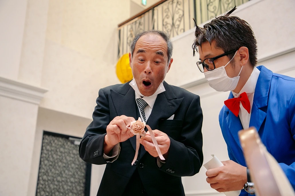 途中、挙式の中で盗まれた指輪を探し出すために「体はおとな 頭脳はこども」が決め台詞の迷探偵コ○ンが登場し、ちんぷんかんぷんな捜索をするも何故かパーティーがスムーズに進んでしまう重要アイテムを発見してしまうという迷探偵ぶりを発揮し次に何が起こるか分からない「ワクワク感?」をゲストに与えます。