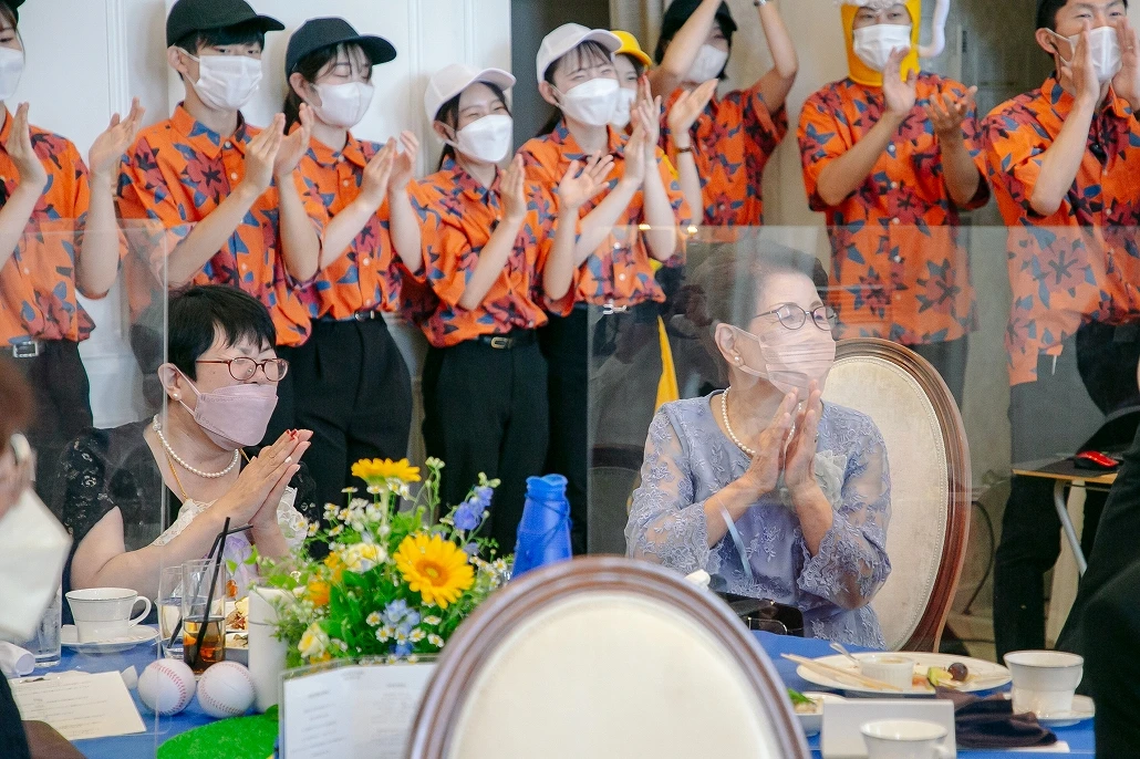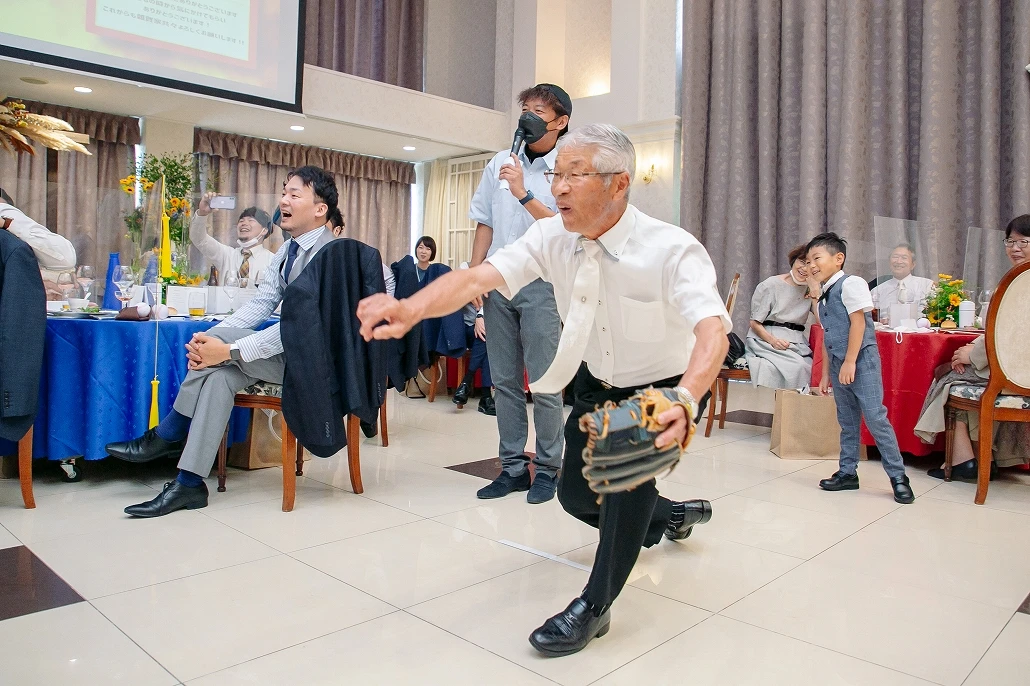キャプテンによる宣誓の後に新婦父の始球式でプレイボール!