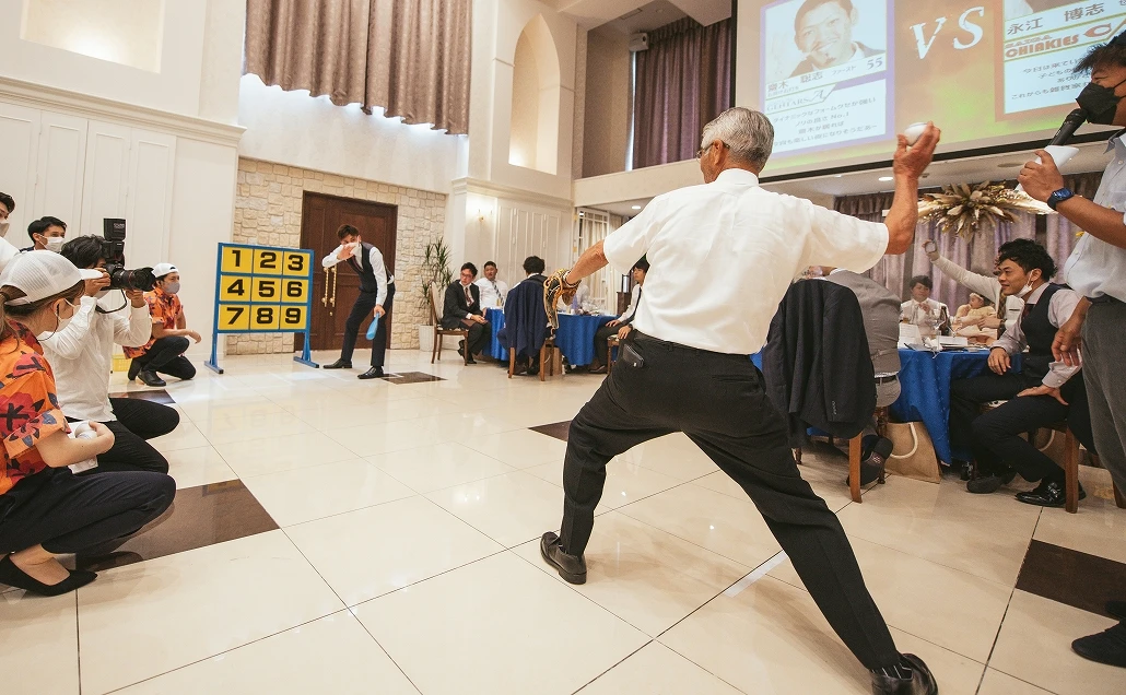受付後に受け取った自分の野球カードをスクリーンに映し出された選手(ゲスト)はピッチャーまたはバッターとして相手を抑える(またはホームラン)を狙って勝負!