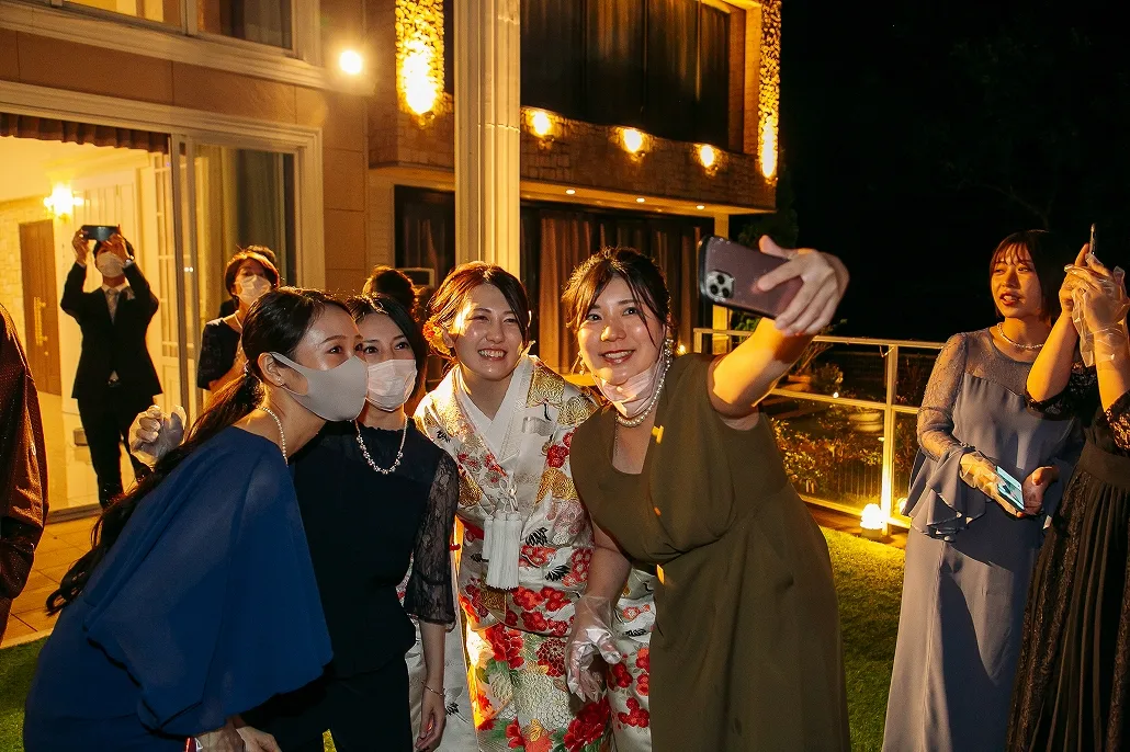 と、開いた先に待っていたのは親友のAさん、Aさんに誘われ歩き出すとテラスのカーテンが開き、そこにははレインボーローズを隠し持った新郎さんとゲストの姿が・・・