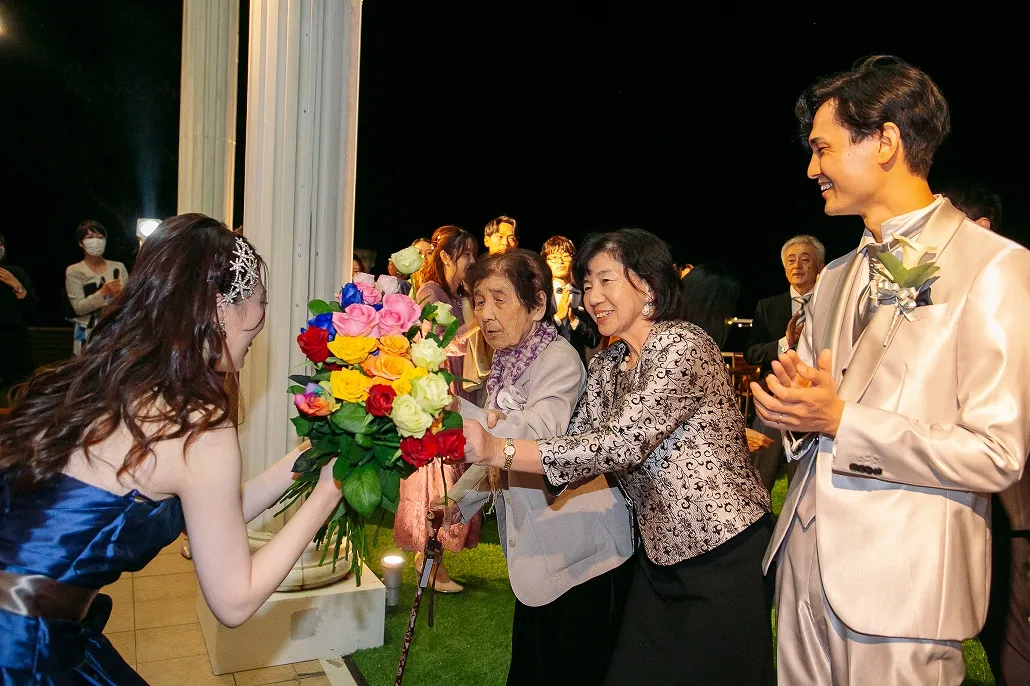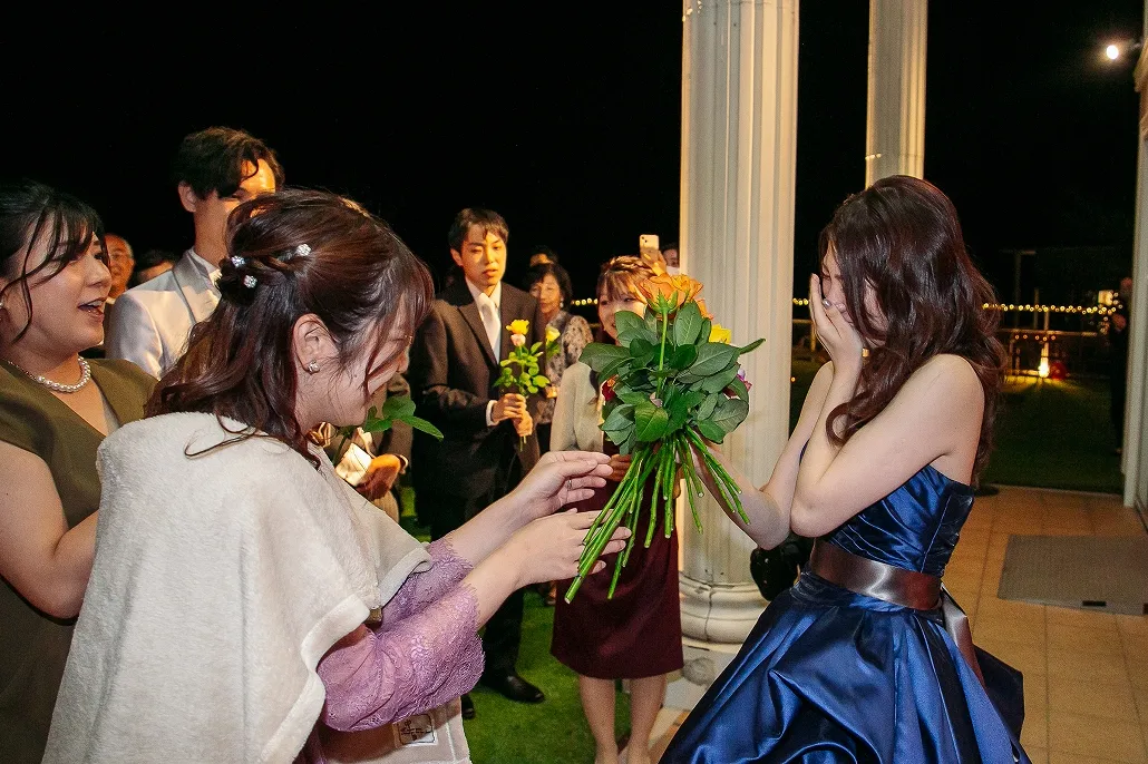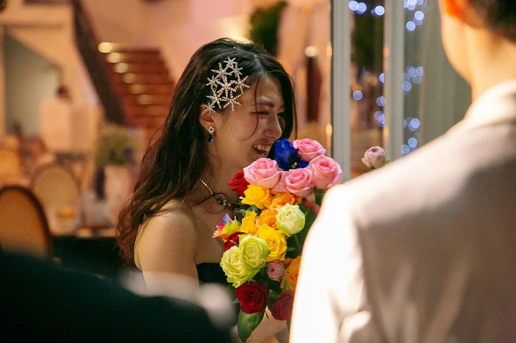 と、開いた先に待っていたのは親友のAさん、Aさんに誘われ歩き出すとテラスのカーテンが開き、そこにははレインボーローズを隠し持った新郎さんとゲストの姿が・・・